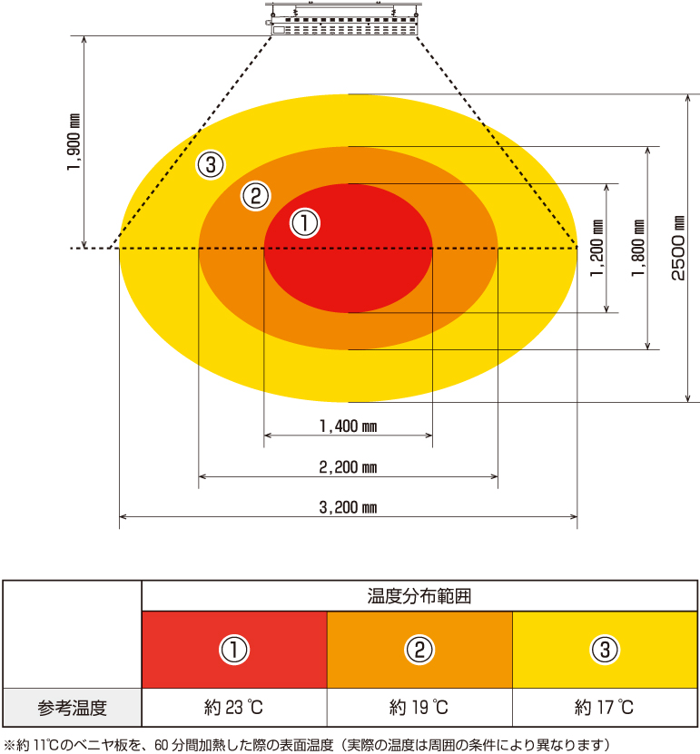従来の熱風式やガス式のように空間全体を加熱して暖めるのではなく、2.0kW級の輻射熱によって人体に直接熱を届けることで、体の表面から深部までを効率的に暖め、高い保温性を実現します。