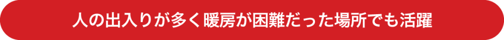 寒い季節でも職場環境改善を「速暖くん®」がしっかりサポート。これまで暖房が困難だった工場出入口・駅ホーム・物流倉庫・屋外トイレ・仮設現場などの開放・半開放空間でも効果を発揮します。