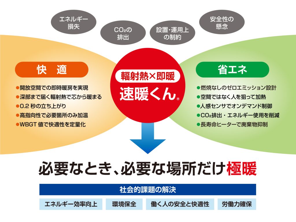 「速暖くん®」は、0.2秒で立ち上がる高効率・高輝度の赤外線カーボンヒーター「オレンジヒート®」を搭載した、開放・半開放空間向けの局所暖房装置です。