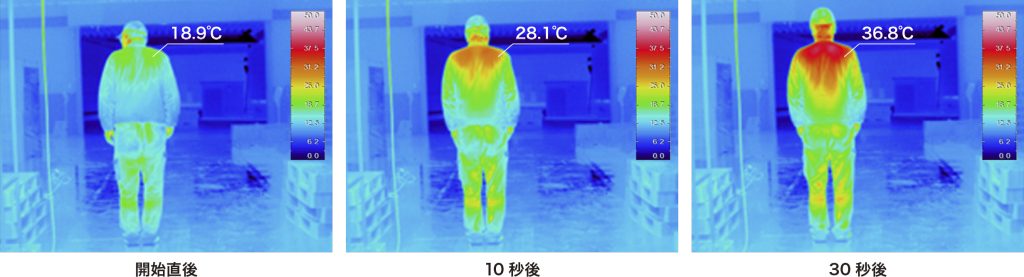 評価結果では、気温10℃の環境下において、設置高さ2.0mから赤外線を照射したところ、わずか10秒で約+10℃の温度上昇、30秒後には+18℃の36.8℃を実現。輻射熱が衣服を透過し、皮膚表面までしっかりと熱を届けていることが確認されています。