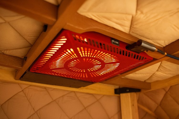 レトロな外観の真っ赤な植毛ガードに加え、赤い光がコタツ布団の中をやさしく照らし、視覚的なあたたかさをもたらします。
