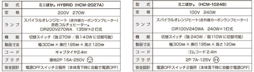 200V 仕様の「ミニぽか® HYBRID」は、「スパイラルオレンジヒート」と「赤色コルチェヒーター®」を組み合わせた構造を採用しています。